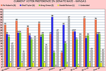 In Kansas, the unpopularity of the incumbent Republican senator (Pat Roberts) and a popular Independent candidate (Greg Orman) has caused that race to be a three-way split between the candidates (with the third candidate being Democrat Chad Taylor). I still expect the Republican incumbent to eke out a win in Kansas, but the truth is that anything could happen there -- including the election of another Independent to the Senate (joining Independent Senators King of Maine and Sanders of Vermont).