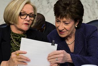Senator Claire McCaskill, left, and Senator Susan Collins presented a 130-page report Wednesday on price gouging by prescription drug makers. CreditDrew Angerer for The New York Times