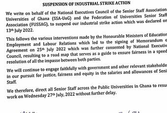 The National Executives Council of the Senior Staff Association-Universities of Ghana (SSA-UoG), has suspended its strike.