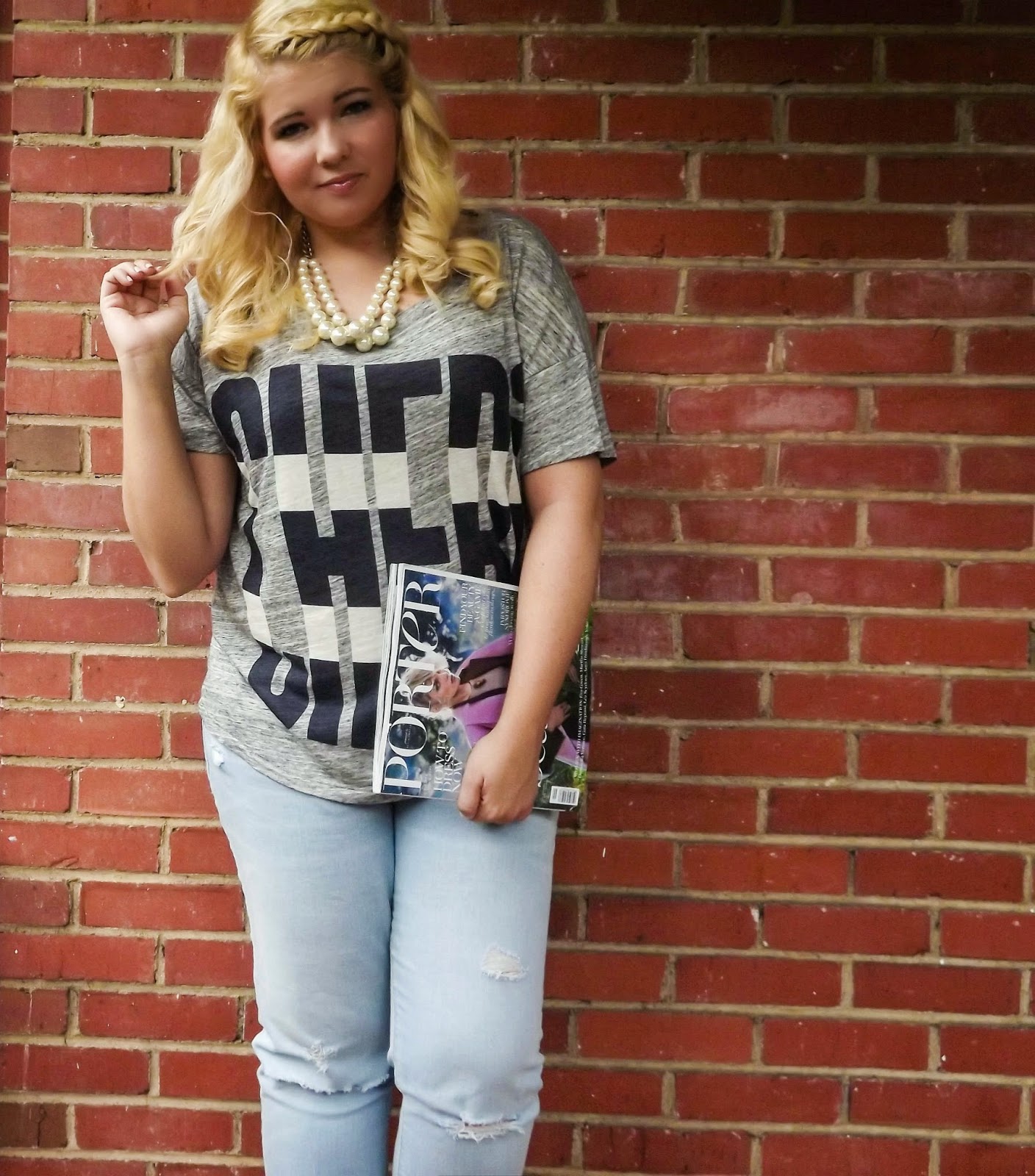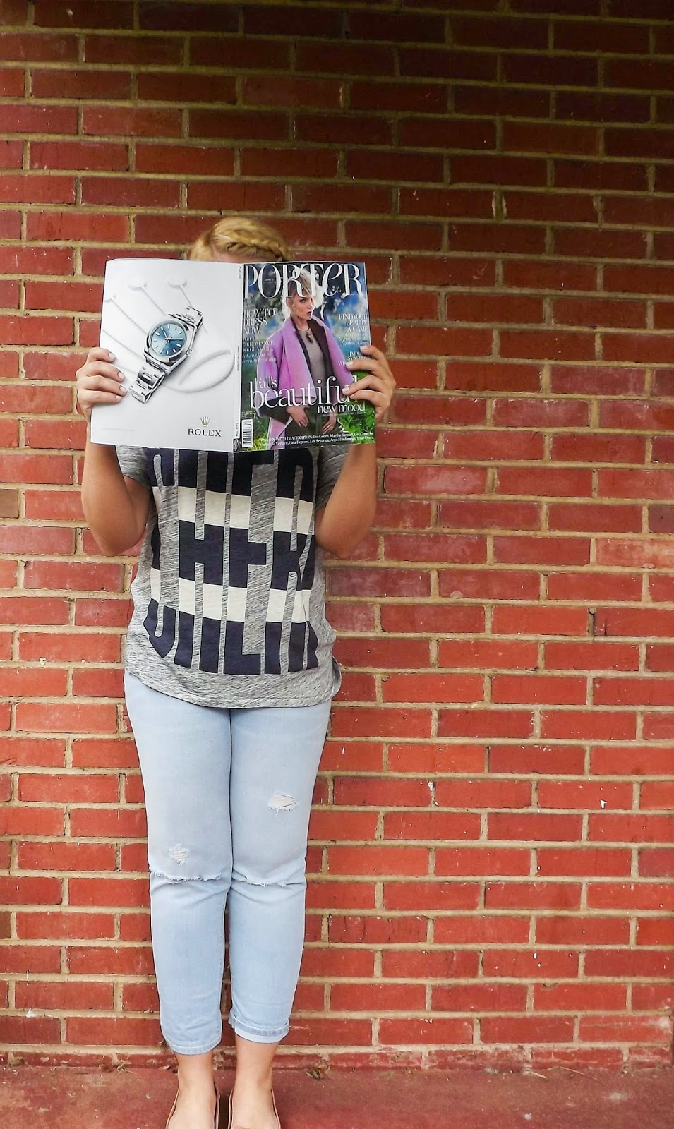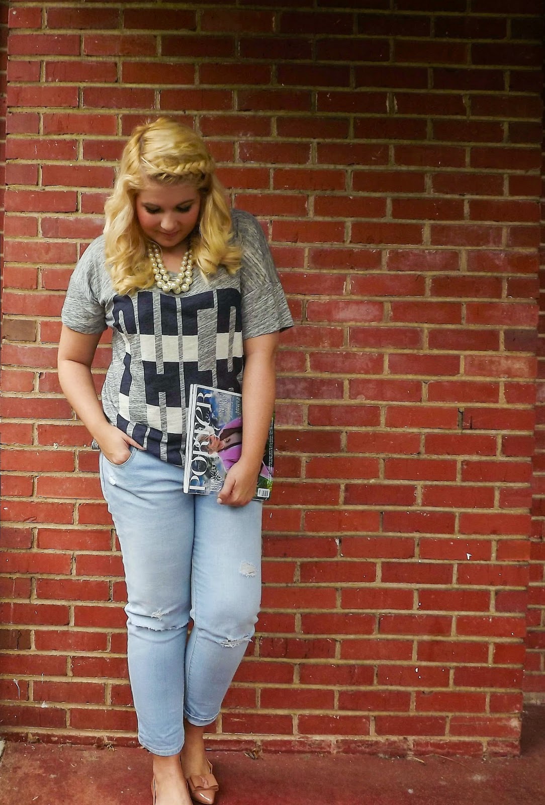 Outfit: T-shirt- J.Crew, Boyfriend Jeans- Old Navy, Flats- J.Crew, Necklace- J.Crew, Magazine- Porter MagazineIt's that time again. Time for the magic of September issues. The pages that we flip through to figure out what perfect pieces we ABSOLUTELY need for this coming fall. We day dream about the fabulous outfits that lay within those glossy pages and how we will possibly attempt that feather skirt for fall.This time is absolutely magical and one of my favorite parts of pre-fall. It marks the turn of the season and makes a time for us to look forward to comfy sweaters, leggings paired with boots, and everything else that comes with the season turning.I picked up this t-shirt on sale on the J.Crew site and immediately knew that it would be the perfect piece to put with a pair of boyfriend jeans. Knowing me, layering pearls and something with a bow on top of it made so much sense. xoBCC