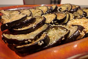 This super simple eggplant with sesame seeds dish is lately one of my favorites and nicely complements a simple dinner bowl. But that's not the only way you can enjoy it. It also works well as a snack on a party table (even if the party is only for me and may or may not mean binge watching the last season of Modern Family...). These eggplant slices go nicely together with hummus, yogurt sauce, and falafel. Alternatively, you can also put them on a bed of sticky rice with spicy stir-fried bok choi and sautéed mushrooms.