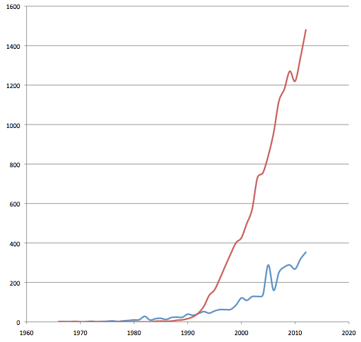 As you can see from this figure that I made using data from Google Scholar, in most papers nowadays people refer to them as 'fitness landscapes' (red line) vs. 'adaptive landscapes'. I obtained this data by searching for either term in Google Scholar by year.Evidently, the idea of fitness landscapes is catching on, to say the least. A Google Scholar search I just did returned well over 2,000 articles that used one of the terms in 2013. The reason for the wide usage is that the concept is very powerful and intuitive. Once the structure of the fitness landscape is known to some extent, we can understand evolutionary dynamics, i.e., how populations evolve can be predicted. I have written about that before (