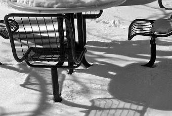 Belonging to a group of photographers can be rewarding, entertaining and educational. Here in Rochester, home of Kodak, there are many gifted 'photogs', and they span many decades in age and experience. What is especially nice is that, in general, the pros are willing to share their knowledge with newbies and veterans alike. This helps to create a harmonious community in which we can all admire and critique each others' work [part of the learning/growing process]. I belong to one such group, which gathers on a monthly basis to view our images that fulfill an assigned theme. Below are two images for the assignment: shadows or silhouettes [or both]. Obviously, I chose shadows; both of these images were generated with my cell phone camera. The conversion to B&W was done during editing.