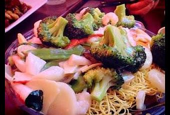 "Seafood Pan Fried Noodles" (海鮮兩面黄 - hǎi xiān liǎng miàn huáng) is a solid take on this dish: a sauce of shrimp, scallop, fake crab, snow peas - and quite a bit of broccoli - poured over crispy thin egg noodles. Quite tasty.