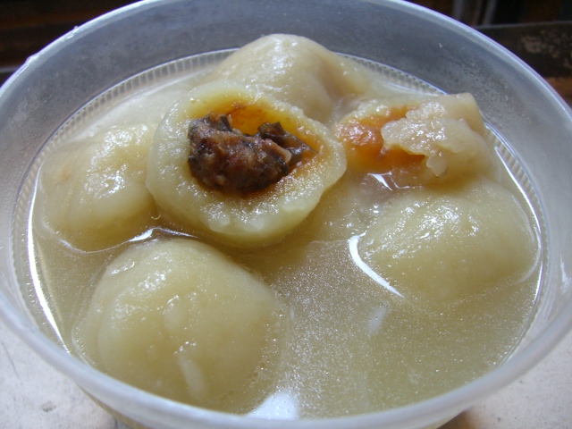 Also on the wall menu is 元宵圆 (yuán xiāo yuán - Lantern Festival sweet dumpling), a dish I have also enjoyed at Happy Garden Palace. They look rather like their potato balls, but whiter - the dumplings are made with glutinous rice flour, filled with the same pork filling (that's MY kind of sweet dumpling!). Like everything else here, a bargain at 10 for $3.00.