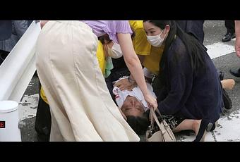 In the video, Abe is seen holding his chest as he collapsed and his shirt is seen smeared with blood. The report said that the 67-year-old Abe was rushed to a hospital.