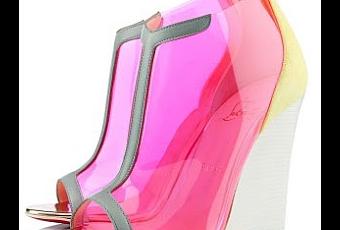 Since we started the week off with a bold transparent shoe, I figured why not continue but seriously, can you blame me? Look at these breathtaking wedges from the shoe god. The Christian Louboutin Scuba Wedges feature very modern attributes - a colored transparent PVC upper, t-strap detail over the pvc, colored leather capped heel, and a stunning metallic 4" wedge heel. Sadly these seem to be sold out but I'm sure some of you may get lucky enough to get your hands on a pair so don't give up hope.
