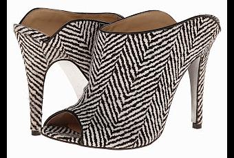 We couldn't help but follow yesterday's shoe with another stunning black and white printed heel. Today's Shoe of the Day features an easy slip-on shootie silhouette that's complimentary to any and every foot. These Kristin Cavallari for Chinese Laundry Lucky Slides boasts a pony hair, herringbone upper, peep toe, low-cut collar,black leather piping around the peep toe and topline, and a wrapped 4 1/2" heel. We love the idea of a herringbone print for sping, but if you desire something a bit wilder, this darling also comes in an eye-catching leopard print.