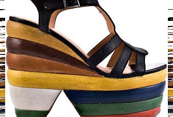 Yummy!! If marble layer cake was a shoe, it would look exactly like this. You guys know I love color and this multicolored and multi-layered platform chunky sandal is like skittles for your feet. Say hello to the ZiGi Girl Sundae Rainbow Platform Sandal, a strappy leather T-strap sandal that features sculpted layers of multicolored leather along the 6 3/4" towering heel with 3 1/4" platform. Both Ferragamo and Jeffrey Campbell previously introduced this retro style, they both featured metallic uppers, ZiGi Girl has balanced the multicolored heel with a classic black upper. Ready for this attention-getter?