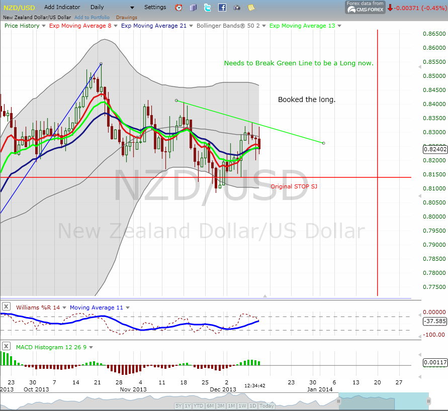 And lastly, in the past two days we had an inside bollinger band turn trade setup on NZDJPY with an initial target of the 50 DMA. This is also a potential double top area on the weekly chart and it may not stop at the 50 DMA. I have been monitoring a potential EURJPY short opportunity, but have not taken action. Though leery of messing with top picking the yen pairs, I am in this NZDJPY bollinger setup and tracking it for the next few days. I am using small charts for entry for now given the yen weakeness and trend. Here is the small chart: