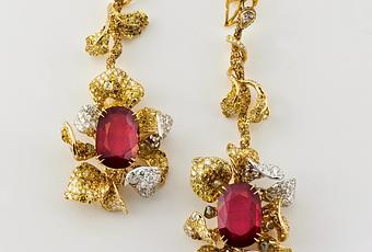 CINDY CHAO The Art Jewel's Ruby Sunflower earrings are the perfect festive gift, set in 18K yellow gold and featuring over 22 carats of ruby, over 7 carats of clear diamonds and over 15 carats of yellow diamonds, these intrinsic earrings are a true masterpiece.The perfect embodiment of the festive period, these earrings are a celebration of artistic talent and sheer opulence.