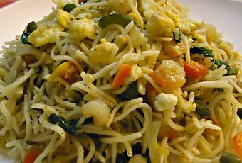 Now heat oil in a separate wok and toss in the chopped garlic n onions. Fry them translucent, now throw in all the chopped veggies except spring onions. Adjust salt n pepper and sauté for 2 minutes. Add the boiled noodles and stir fry. Add vinegar, continue stirring. Put in the shrimps and eggs. Add ajinomoto and spring onions. Fry for another two minutes. Your Shrimps and Egg Stir Fried Noodles is ready to be gobbled up…. :D