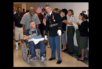 There are families with them as well: the 18-year-old war-bride pushing her 19-year-old husband's wheelchair and not quite understanding why her husband is so affected by this, the boy she grew up with, now a man, who had never shed a tear is crying; the older immigrant Latino parents who have, perhaps more than their wounded mid-20s son, an appreciation for the emotion given on their son's behalf. No man in that hallway, walking or clapping, is ashamed by the silent tears on more than a few cheeks. An Airborne Ranger wipes his eyes only to better see. A couple of the officers in this crowd have themselves been a part of this parade in the past.