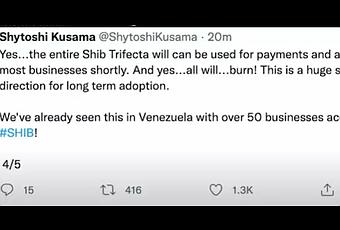 Further, in a trail tweet, he confirmed that all three trifectas, which are Shiba Inu, Bone, and Leash tokens will be used for payments and will be accepted by businesses shortly. He said, "Yes...the entire Shib Trifecta will be used for payments and accepted by most businesses shortly. And yes...all will...burn! This is a huge step in the direction of long-term adoption. We've already seen this in Venezuela with over 50 businesses accepting!."