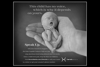 The ad features a hand holding a 20- to 24-week-old baby with the quote, “This child has no voice, which is why it depends on yours. Speak Up.”