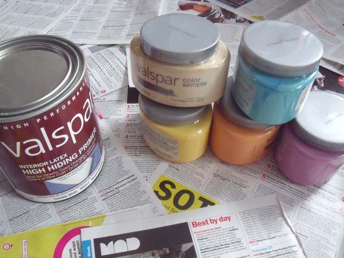 PaintingStep 1: Get your painting area ready by placing recycled paper or a drop cloth beneath the table and set out all of your paints and primer.