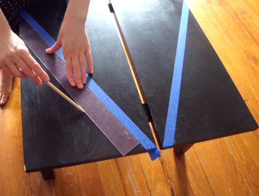 Steps 6: Continue making marks and taping until that portion of the table resembles your design. Any tape that intersects the horizontal or vertical pencil line (from step 3) cut the tape so it meets the line but does not cross it.