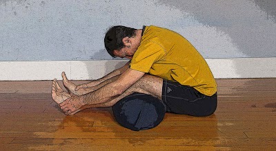 by NinaI’ve designed this quieting sequence—which can be helpful if you are suffering from stress, anxiety, or just need to chill—to prepare you to practice supported seated forward bends. If done with the right amount of support, seated forward bends can be very quieting poses. However, unless you are naturally very flexible in your hamstrings (the backs of your thighs) and your back muscles, you do need to experiment a bit with different types of propping to find the type of support that will the poses feel nurturing and calming rather than uncomfortable and aggravating.Basically there are two different ways to support yourself in a forward bend. The first one way—which Baxter mentioned in his post Male Body Image and Yoga as a revelation to him—is to use a bolster or rolled blanket under your straight leg or legs. For example, here is Baxter in Seated Forward Bend (Paschimottanasana).