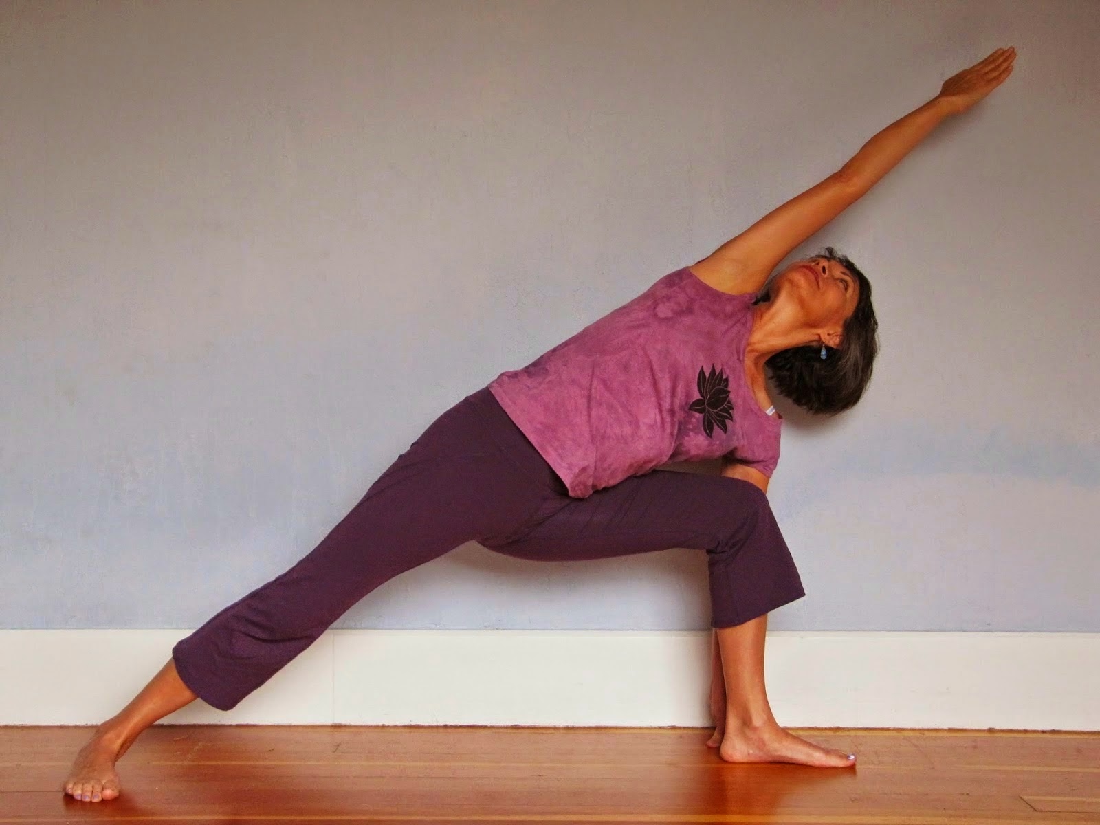 Extended Side Angle Pose (Parsvakonasana), 30 seconds to 1 minute per side. After you bend your front knee, focus on lifting up and over your hip joint as you keep lengthening your spine to come into the pose. Move slowly in and out of the pose to maintain quietness. Use enough support for your bottom hand to keep the pose comfortable.