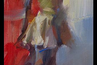 My biggest struggle was with the legs which I`d slapped on with confidence in an almost-correct position. They weren`t right, but they were `good`. Robert Genn in his blog `The Painter`s Keys`once referred to it as `wrong and strong`, and it caused a real dilemma. My option was to repaint the legs entirely and, inevitably, lose the freshness of the marks. I decided to let them remain as they were. If it had been an error in the focal area of the upper torso, I`d have made a different choice, but I decided that, for their level of importance, they legs could stay as they were.