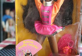 While both versions wear identical outfits and share the same hair style, the black Baton Twirling Skipper has a pair of large purple eyes with some brown accents.