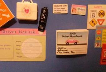 Besides the two dolls and the car itself, the accessories are pretty neat, too! In this set, you get orange cardboard cones, your very own faux license, a first aid kit and cell phone, cardboard signs describing the rules of the road and Skipper’s very own drivers license and insurance card.