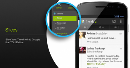 For Twitter fans,we've got exciting news. This time it appears the latest Twitter apps from developers TweetCaster. Slices is an application that is intended for new users which give priority to applications that are easily accessible and provides the functions of the more recent to the old user.Sure Twitter apps like normally, Slices will accommodate the user to search for users were followed, as well as continue to update with the development of our friends who already follow.
