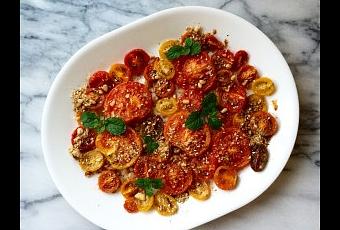- When the tomatoes are done, plate them and top with a sprinkling of dukkah, a drizzle of olive oil from the pan, and some fresh mint if desired. Enjoy!