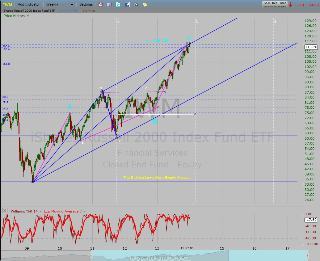 You may remember the bearish count on small caps I have been tracking. This count has a triangle in the wave two position of a large ABC up. A triangle in the wave two position is bearish. This count has completed and now with today's down move, we have a lower weekly low. This count anticipates long term five waves down to break the 2009 low. Here is the chart: