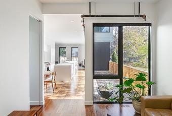 Post Architecture designed this 1,800-square-foot home for two yoga studio owners in Toronto. A century-old coach house that formerly occupied the site was deemed to be in too poor shape to restore. Since the house is on a small lot—adjacent to the existing, main house—and close to its other neighbors, architect Gloria Apostolou devised a C-shaped structure that receives light from a south-facing courtyard, creating privacy in the other directions.