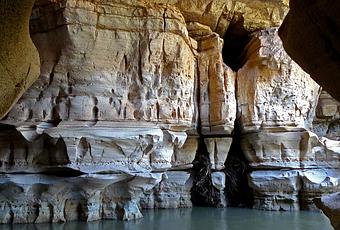 It is said that Allah revealed the opening to this limestone cave system to Sheikh Sof Omar in the 12th century. The sheikh and his followers used the caves as a mosque, a purpose to which the caves were well suited as they had been eroded into columns, buttresses, domes, vaults, and pillars-a natural architectural marvel still used as a gathering place by local Muslims.The First religions in this part of Africa were essentially spirit worship and ghost cults in which the most powerful supernatural beings were believed to attach themselves to trees, rocks, and - most forcefully - to caves, which became shrines for prayer and sacrifice. Even today, the visitor to Sof Omar can see many signs of the persistence of such pagan beliefs and practices: a group of men sacrificing a goal; tokens of leather and cloth hung from rocky projections in the cave.You approach the Sof Omar caves through the tiny village of Sof Omar, perched on the cliffs above the Web River. To the rear of the village is a dark, gaping crevice down which a precipitous narrow footpath winds to the first cave's floor. Only a few patches of sunlight filter into this dimly lit kingdom, which extends in all directions through vast subterranean passageways of polished white limestone, carved by the river's flood and recess over countless ages. In this realm of dry, cool caves nature has worked a marvel of architecture - soaring pillars of stone twenty metres (66 feet) high, flying buttresses, fluted archways, and tall airy vaults. Finally, the river itself is reached, a sunless sea flowing through a deep gorge. Standing on a balcony near the roof, one has a spectacular view of the river rushing below. Sof Omar's large central hall, the 'Chamber of Columns' - so named after the colossal limestone pillars that are its dominant feature - is one of the highlights of the cave system. At another part of the network there is a small gap in the rocks through which the river passes, about two and a half metres (eight feet) wide, where a bridge can be made with driftwood to go across. The most direct route through the caves passes these and many other remarkable sights, and takes about an hour at a good walking pace.