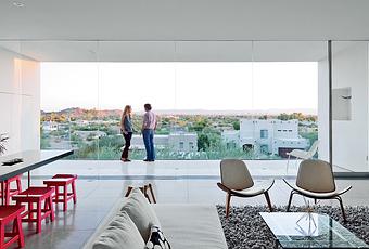 At the base of Echo Mountain in Phoenix, a geometric home by Wendell Burnette opens up to the surrounding desert landscape. For the seating area, the owners selected a Charles sofa by Antonio Citterio for B&B Italia in addition to CH07 Shell chairs by Hans Wegner, a PK61 coffee table by Poul Kjærholm, and a Nesta rug from Design Within Reach.