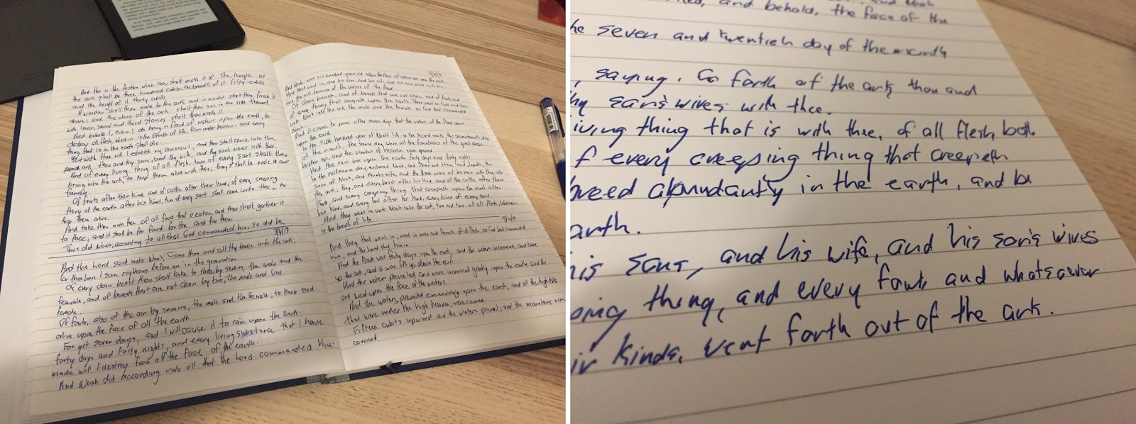 Some thoughts on how well this is going to goBecause I was bored on day and am a huge nerd, I decided to practice writing with my nondominant right hand. I was going to just chug through Faith's training pack but we don't need the data and I wanted to do this for a while and I wanted to read something I wouldn't otherwise, so I am currently copying out the King James Bible, beginning at Genesis.