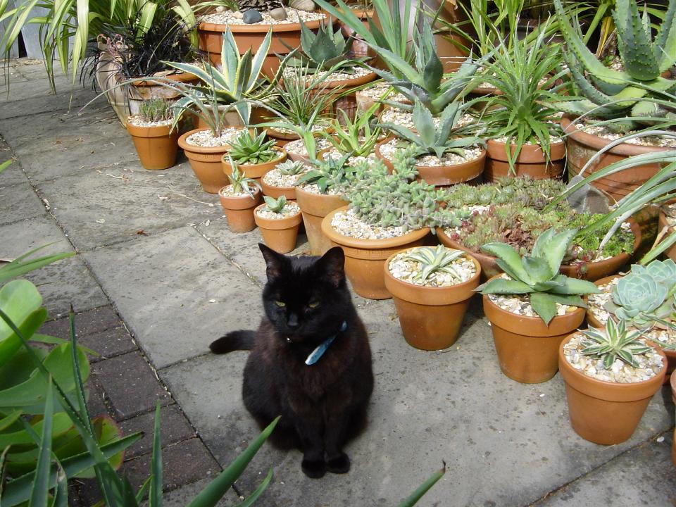 I was a 'dog' person before and never really liked cats for reasons I don't know, more likely I was just preconditioned not to like cats after being a dog owner for years and years. And then I was introduced to Charcoal many years ago, not so much as a choice but as part of the 'package'. And she took an instant liking to me and she won me over, for she was very affectionate and was a great company in the garden.Charcoal guarding some of my succulents in August 2007