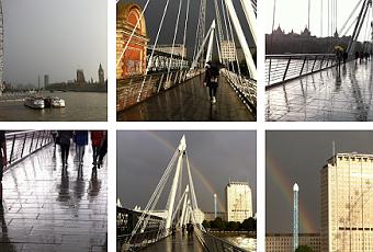 A short sharp heavy downfall was followed by a burst of strong sunshine which created a fabulous double rainbow against a deep gray sky and a shadow of the London Eye on the Shell building.