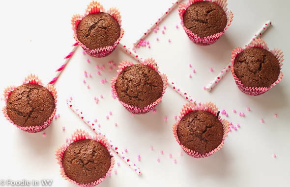 This recipe has 11 ingredients. It takes 30 minutes of total time, 10 minutes of which is active and makes 12 cupcakes. I made a few changes to the original recipe. First I used muffin liners that I got on clearance after Valentine's Day. I love when I only have to pay a few cents for liners. Second, I found that my baking time was a little longer than the recipe, 25 minutes total. Make sure to watch the cupcakes closely, they will go from done to burnt very quickly.