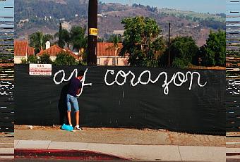 The goal of “ay corazon” is to beautify an otherwise blank or blighted space. When viewing the sculptural piece, the South El Monte audience is meant to insert the image of their personal sweetheart. Also unlike the often illegible quality of elaborate graffiti scrawlings, “ay corazon”’s typeface is a neat cursive that resembles the tidy handwriting many of us were taught in grade school. In addition, the dark chalkboard green color of the tarp that runs against the length of the fence also lends itself to grade the school association. In short, “ay corazon” is a playful project.