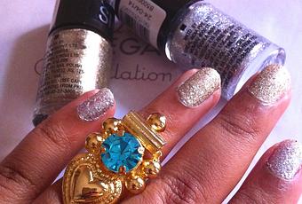 Today, I have the shades All that Glitters, a beautiful dull gold and Dazzling Diva, a radiant silver on my nails. The ring is by Valliyan.