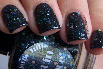 A sheer black filled with metallic blue, silver and holographic glitters of various sizes. Insanely sparkly and I can really get lost in the depth of all the glitters. You can of course layer this over black but I prefer to build up the color for the depth. The black base is slightly unusual though - it is filled with very fine black specks that somewhat resemble noise. I don't quite know how to describe it but it is pretty obvious on the first coat. It is no longer that noticeable thereafter but I thought it was pretty cool nonetheless. You can try spotting some of the specks on the glitters in the closeup on the left.