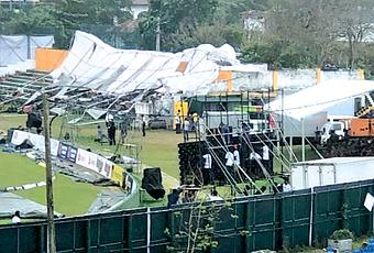 Makeshift grand stand at Galle International Cricket Stadium were blown away due to gusty winds accompanied by heavy rain in Galle yesterday. Picture by Sirangika Lokukaravita, Karapitiya group correspondent