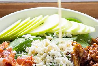Well, I have a salad for you, with all of those components. But I feel like I’m misleading you guys a little bit. This salad…well, there’s spinach, an apple and a bit of onion. And then there’s bacon…cheese…and walnuts that are tossed in maple syrup.