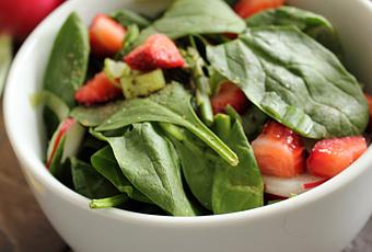 In a medium bowl, toss spinach, scallion, radishes, asparagus, celery, and strawberries. Sprinkle a bit of salt, pepper, and lemon zest.
