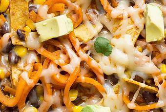 Spiralized sweet potatoes are cooked up with corn, black beans, tortillas and enchilada sauce in this quick enchilada short cut meal!