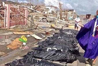 Order of Augustinian Recollects Fr. Charlie Orobia blesses bodies waiting to be buried after a storm surge from Super Typhoon Haiyan killed scores of people in Tacloban City. (Order of Augustinian Recollects Br. Jaazeal Jakosalem)