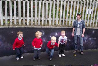 With the Help of Daniel Kehily-Jones the preschoolers at Rainbow Preschool, Merton can now explore the universe while using their outdoor play area. The preschool put out a plea for help as our outside play area was looking a little worse for wear and Dan kindly came to the rescue. Now the preschool has a great new piece of art to inspire imaginations and encourage play.Rainbow preschool is a small rural preschool run by parents for their children with an emphasis on learning through play. Play helps young children to learn and develop through doing and talking, which research has shown to be the means by which young children learn to think. Our setting uses the Development Matters in the Early Years Foundation Stage guidance to plan and provide a range of play activities, which help children to make progress in each of the areas of learning and development. We hope our new piece of art will be at the center of many child lead explorations through space and art. We are now hoping to turn the children’s summer house into a space ship so they really can blast off.