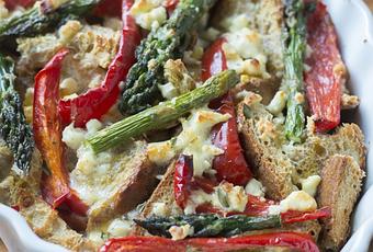 Meanwhile, butter a medium casserole dish. Arrange a layer of torn bread on the bottom, sprinkle with 1/4 cup feta cheese. Once vegetables finish roasting, arrange half of asparagus and bell pepper on top. Repeat with a second layer of bread, cheese, and vegetables.