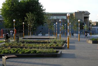 St Mary’s Churchyard, Elephant and Castle, London – Frontage to Park with Planters and Lighting