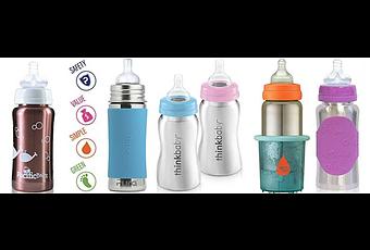 The thinkbaby stainless baby bottles were really impressive, and they come in at a slightly better price point than the Pura Kiki, at around $13 per 9-ounce bottle. We loved several things about these bottles, including the sleek hour-glass shape, the plastic collar that seals itself very well onto the bottle, and the vented nipples. The bottles are dishwasher safe, and it was easy to fit a typical bottle brush inside for cleaning. They never leaked in our testing, though they did condensate quite a bit with a colder beverage. That's primarily because they don't include a silicone sleeve on the outside. The other two downfalls of not having the silicone sleeve are that when you heat the bottle in a bottle warmer the stainless get super hot to the touch, and second it's not as comfortable to hold. We also want to point out that while we prefer the thought of having a stainless steel collar, like with the Pura Kiki, we do see the benefit of having the plastic collar - it is much easier to seal well onto the bottle, and you don't need to really crank it down like you do with a stainless collar. So while we prefer totally non-plastic, we definitely see the advantage of the plastic collar. Speaking of leakage, the nipples were surprisingly leak-free. They were also quite good at venting to prevent gas, and not as squishy/flimsy as the Pura Kiki. The only downfall we found with these bottles was the lack of the silicone sleeve, which we think is unfortunate. With a nice sleeve, I think these would definitely be at the top of our list! Interested? Check out the thinkbaby Stainless Baby Bottles here.