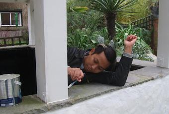 Fortunately the temperatures were mild enough to allow some play with water as we set up this water feature. The stainless steel geyser had to be adjusted to the desired height and for that you had to dip in to make the adjustments. Thank goodness it wasn't too cold to dip in, and now it's up and running. All that's left to be done is to apply the slate mulch and rocks at the bottom as planned.