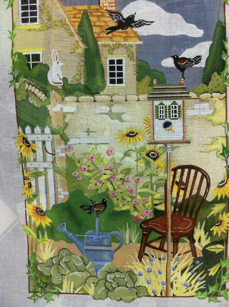 Palma chose a Mary Lake Thompson garden scene for her game canvas, and her take on the clue could become the beginning of a short story: "Humphrey the bird had too much to eat and drink during the holidays. Worried about her husband's waistline Helga, a.k.a. Mrs Bird, hired a personal trainer, Mr Bunny to get her husband back in shape. He was told to fly 10 times around the neighborhood as part of his daily exercise. Helga was on watch duty to make sure Humphrey would not make a beeline to the house and make it to the couch. Junior was very proud of papa."